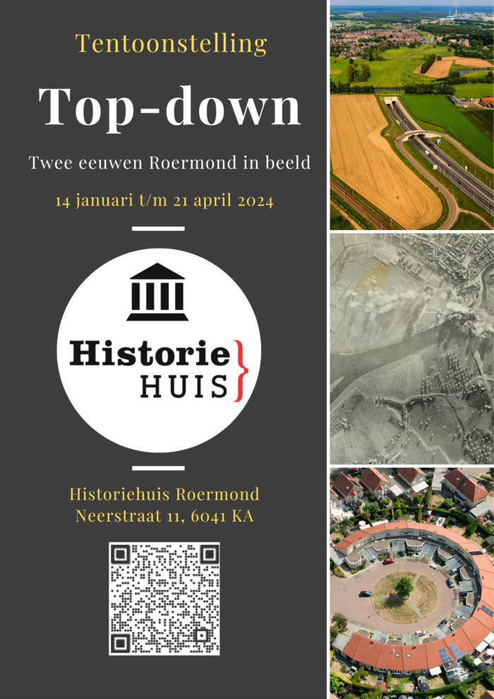 De tentoonstelling Top-down: Twee eeuwen Roermond in beeld, toont de historische ontwikkeling die Roermond heeft doorgemaakt aan de hand van vier thema’s, die haar vandaag de dag kenmerken. Door middel van deze thema’s worden historische processen weergegeven. Luchtfoto’s en droneshots tonen dit vanuit het vogelperspectief. De selectie luchtfoto’s en droneshots tezamen geven een beeld van Roermond in goede en in slechte tijden, gedurende de afgelopen twee eeuwen.