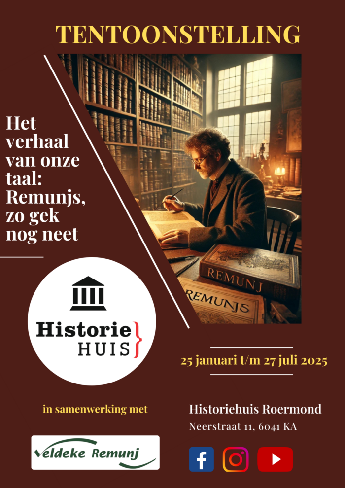 Met een veelzijdige collectie van historische documenten, objecten en beeld en geluid, nemen we u mee op reis door de wereld van het Remunjs. U hoort verhalen van vroeger en nu, en maakt kennis met de unieke klanken en uitdrukkingen die dit dialect zo geliefd maken. Van spreekwoorden en gezegden tot hedendaagse woorden en uitdrukkingen die jong en oud verbinden, deze tentoonstelling laat zien dat het Remunjs allesbehalve ‘gek’ is, maar juist een taal vol trots, traditie en creativiteit.